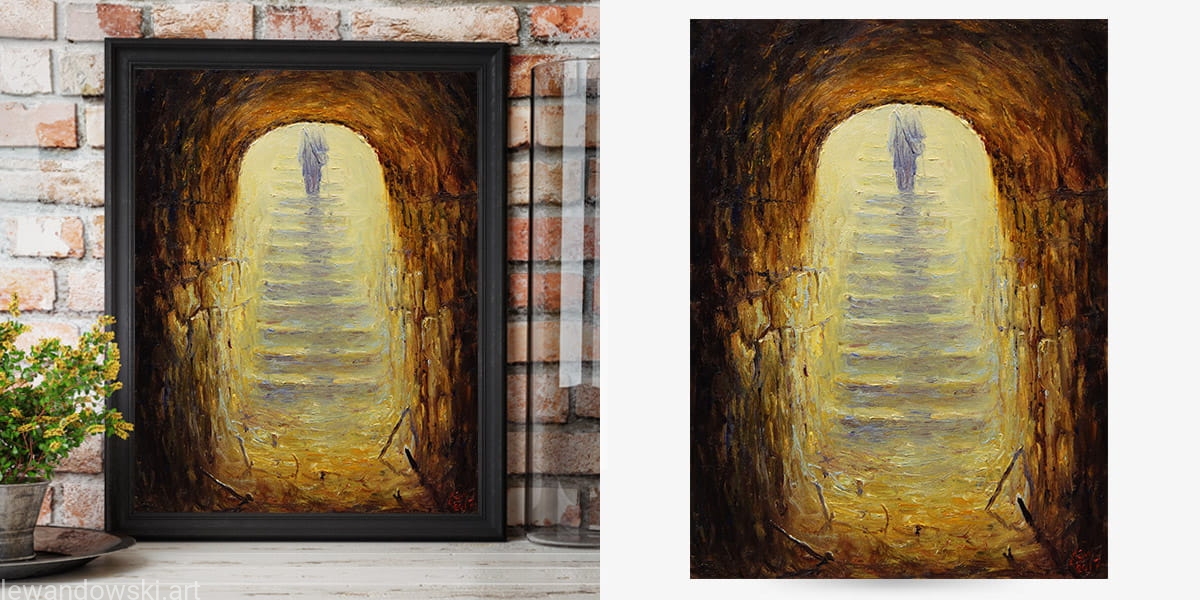 High-quality poster/print on paper based on surreal oil painting by Mariusz Lewandowski titled "COMING OUT OF THE SHADOW".
