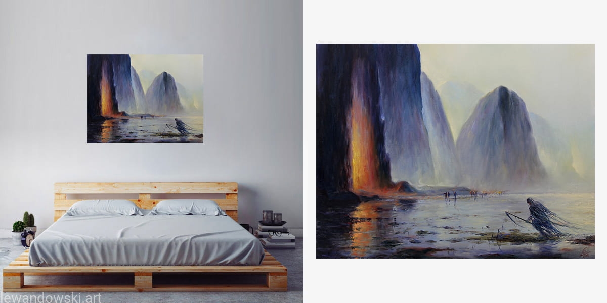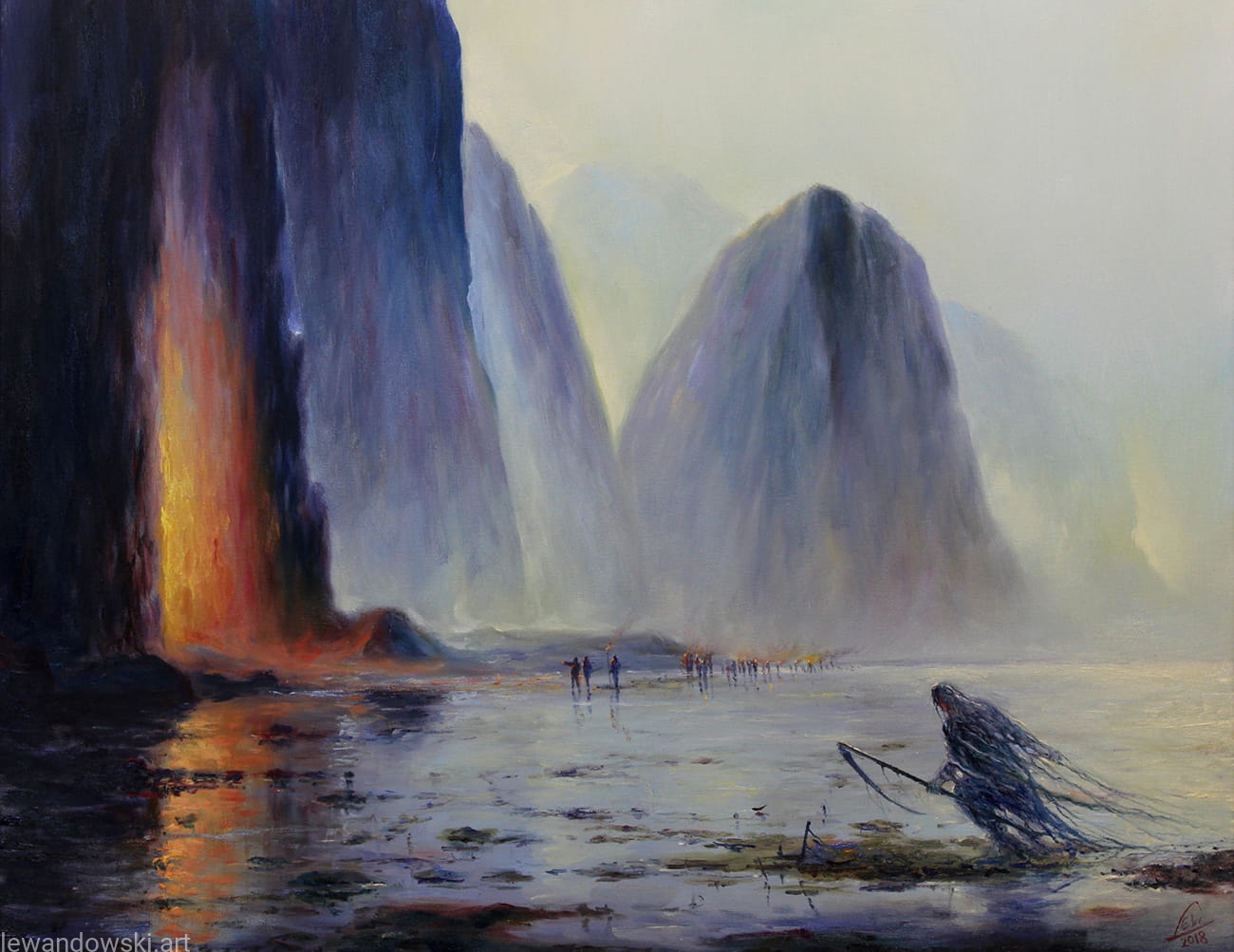 Mariusz Lewandowski’s painting Death Meeting presents an ominous scene where nature looms over human existence like an overwhelming force. In the foreground, we see a figure, possibly the personification of Death itself, bending towards the ground, holding a scythe. This figure appears ethereal, almost woven from shadows and mist, underscoring its otherworldly and elusive nature.