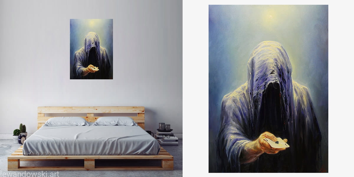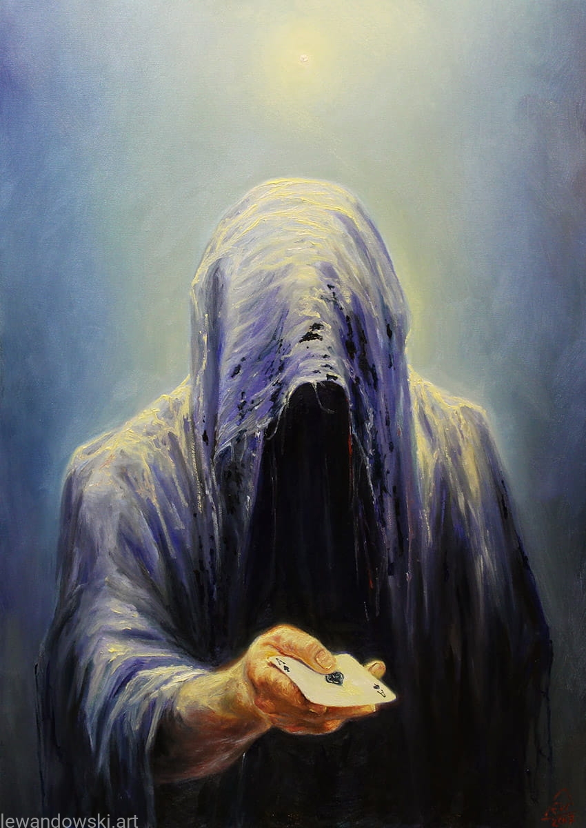 The painting shows a figure in a mysterious, hooded cloak, holding a playing card in his outstretched hand. The character is shrouded in an aura of mystery, which is further emphasized by the dark colors and dark shadows. The background of the painting is in cool, bluish tones, which gives the whole thing a surreal and slightly mystical atmosphere.
