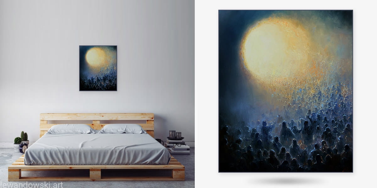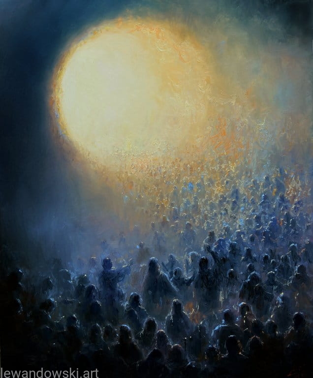 The painting "Immemorial Desire" by Mariusz Lewandowski depicts a crowd of shadowed figures advancing through a surreal space toward a vast, luminous circle dominating the sky. This light, appearing to symbolize transcendence or an elusive pursuit of the unknown, illuminates the figures who, despite the darkness, seem filled with determination. As part of Polish surrealism, Lewandowski explores the idea of humanity's journey and the search for meaning in a world full of mysteries.