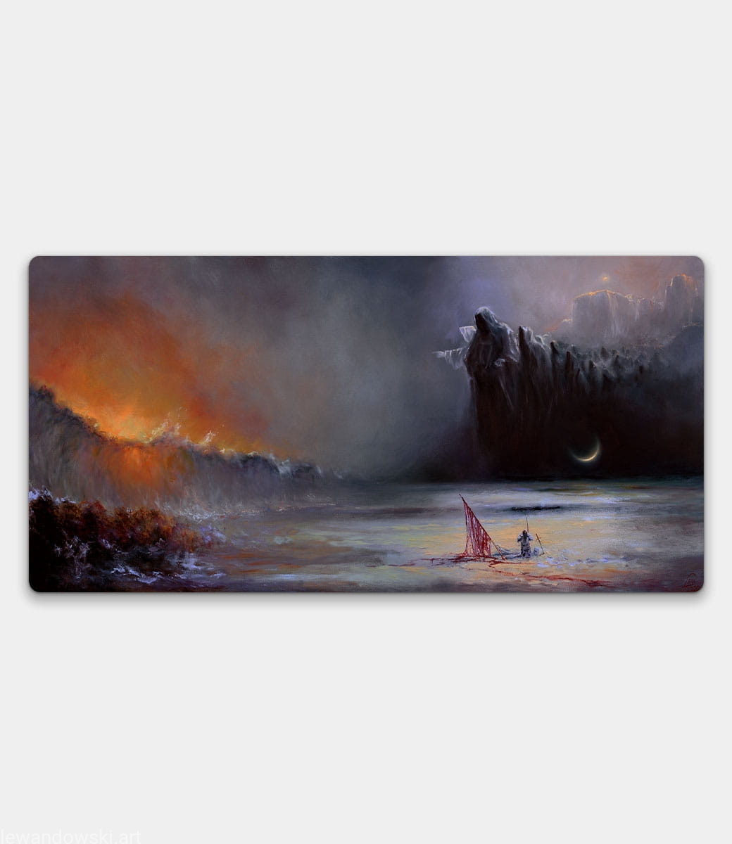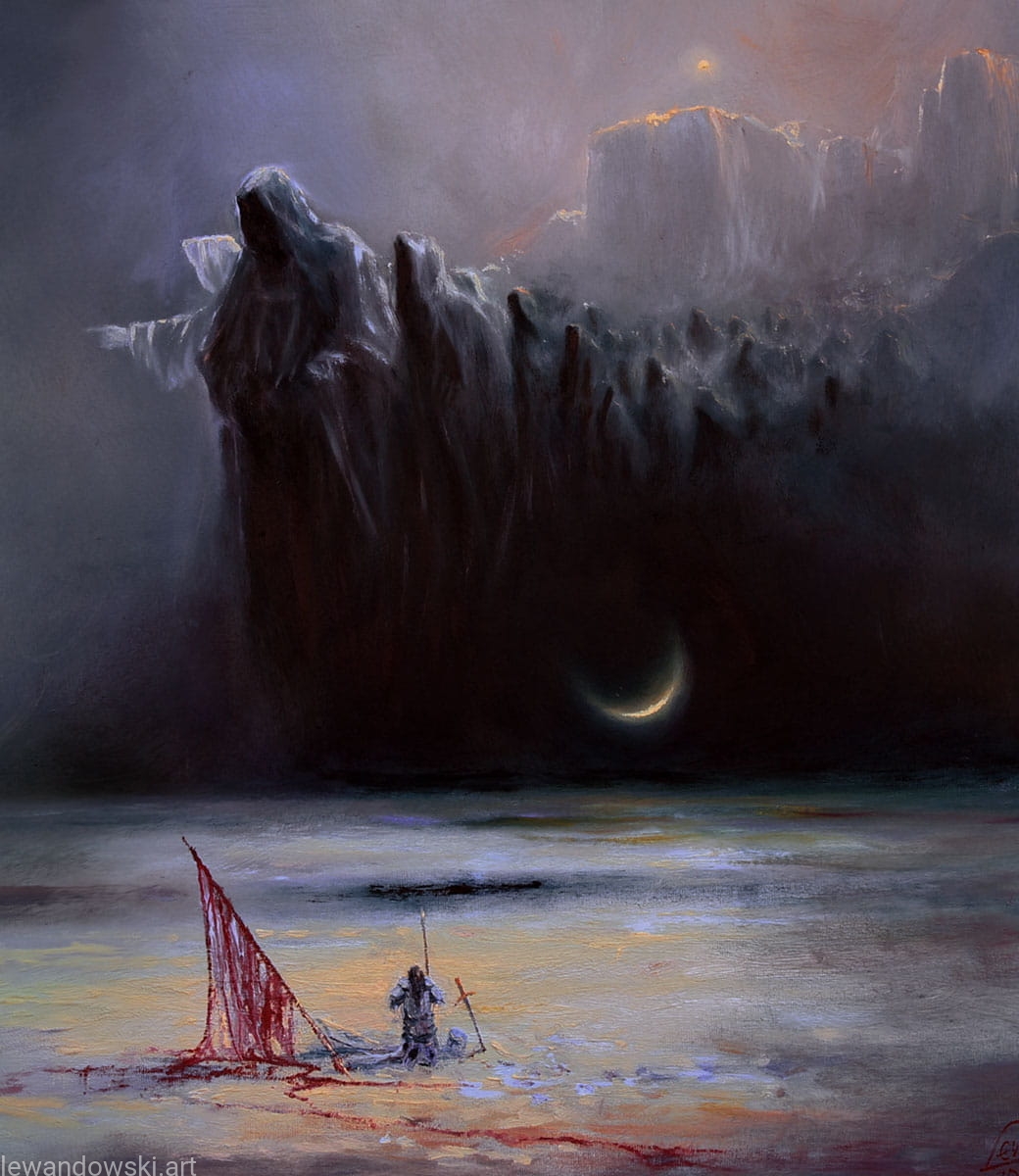 The central element of the painting is the figure of a man in armor, kneeling on the ground next to a destroyed red flag. In the background, on the right, you can see dark, massive cliffs or mountains, which enhance the feeling of monumentality and awe. In the background you can also see a mysterious, narrow crescent moon floating over the calm sea, reflecting the light in the water.