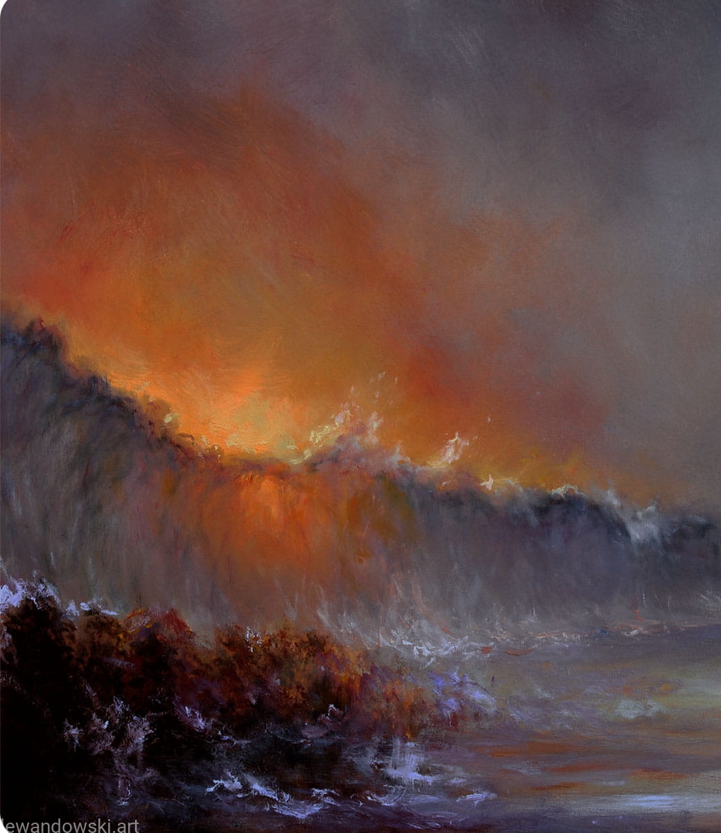 The painting also includes numerous details in the form of silhouettes of figures on the horizon emerging from the rocks. The entire composition is characterized by rich textures and depth of colors, which gives the image dynamism and depth.