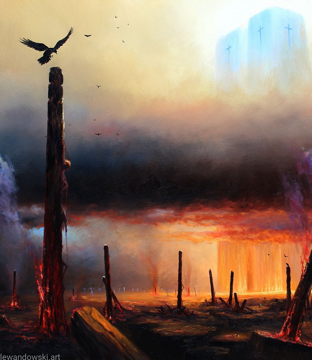 The composition is dominated by a desolate landscape filled with charred, burned stakes that resemble crosses—a symbolic reference to the pyres used to burn heretics in times past. Perched on one of these wooden posts is a black crow, a bird often associated with the inevitability of death and dark omens, heightening the sense of unease.
